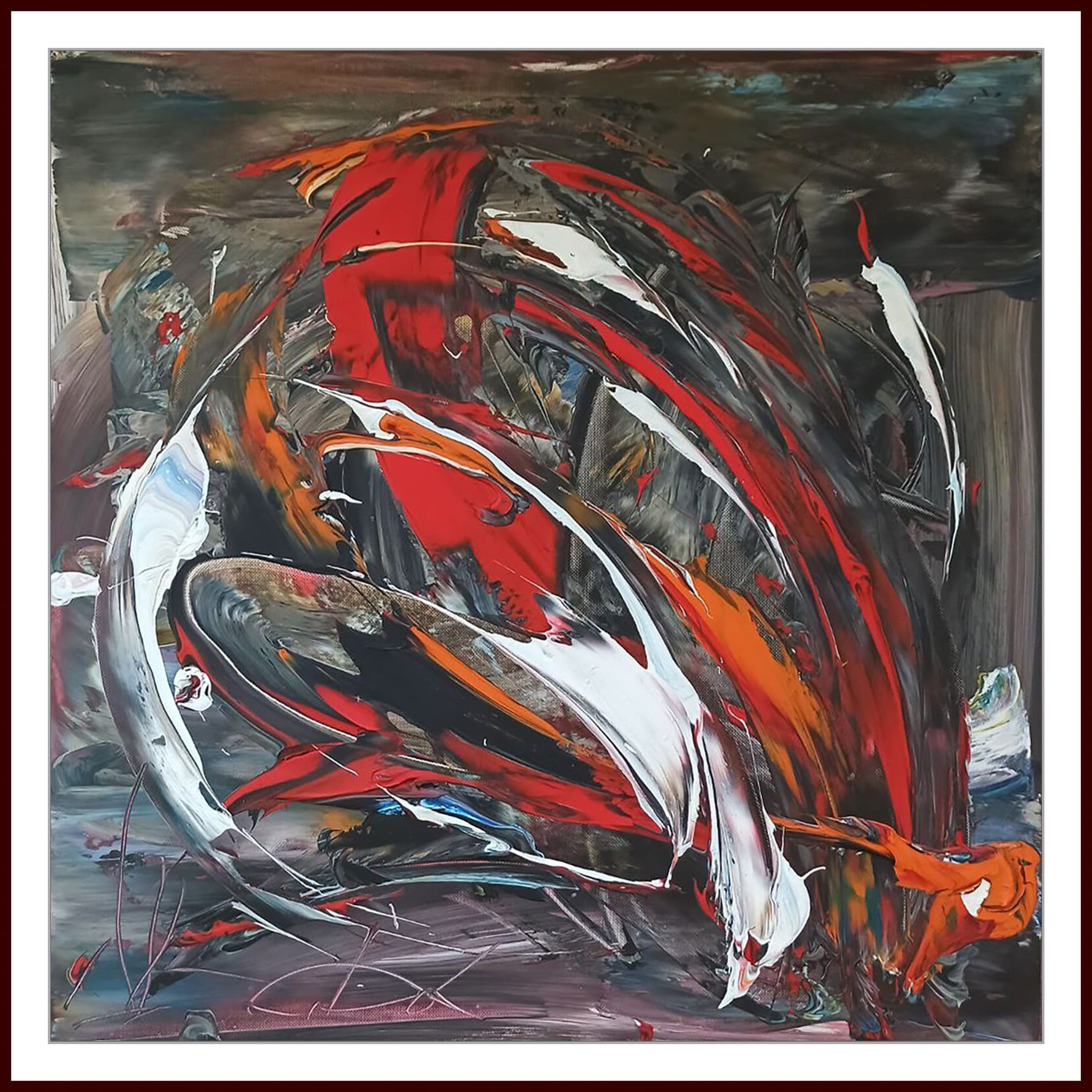 Сергей Дас и Кирилл П. 15 лет. Холст, акрил. У Кирилла - синдром Дауна, но он значительно отличается от других детей с таким диагнозом, которых, как правило, называют «солнечными», потому что они очень дружелюбные и улыбчивые. Кирилл же - полная противоположность этому. Спокойный и серьёзный, он напоминает сдержанного самурая. Даже внешне в нем есть что-то от азиатского облика, и выдуманный им самим уникальный язык напоминает то ли китайский, то ли японский. Так, например, свою воспитательницу Татьяну Анатольевну Кирилл называет Нана Кибо. Что это значит - известно только ему одному. Видно, что подросток живет в своём внутреннем мире, который не могут понять другие. Только иногда кто-то из детей может понять мальчика и даже поддержать «беседу» с ним.