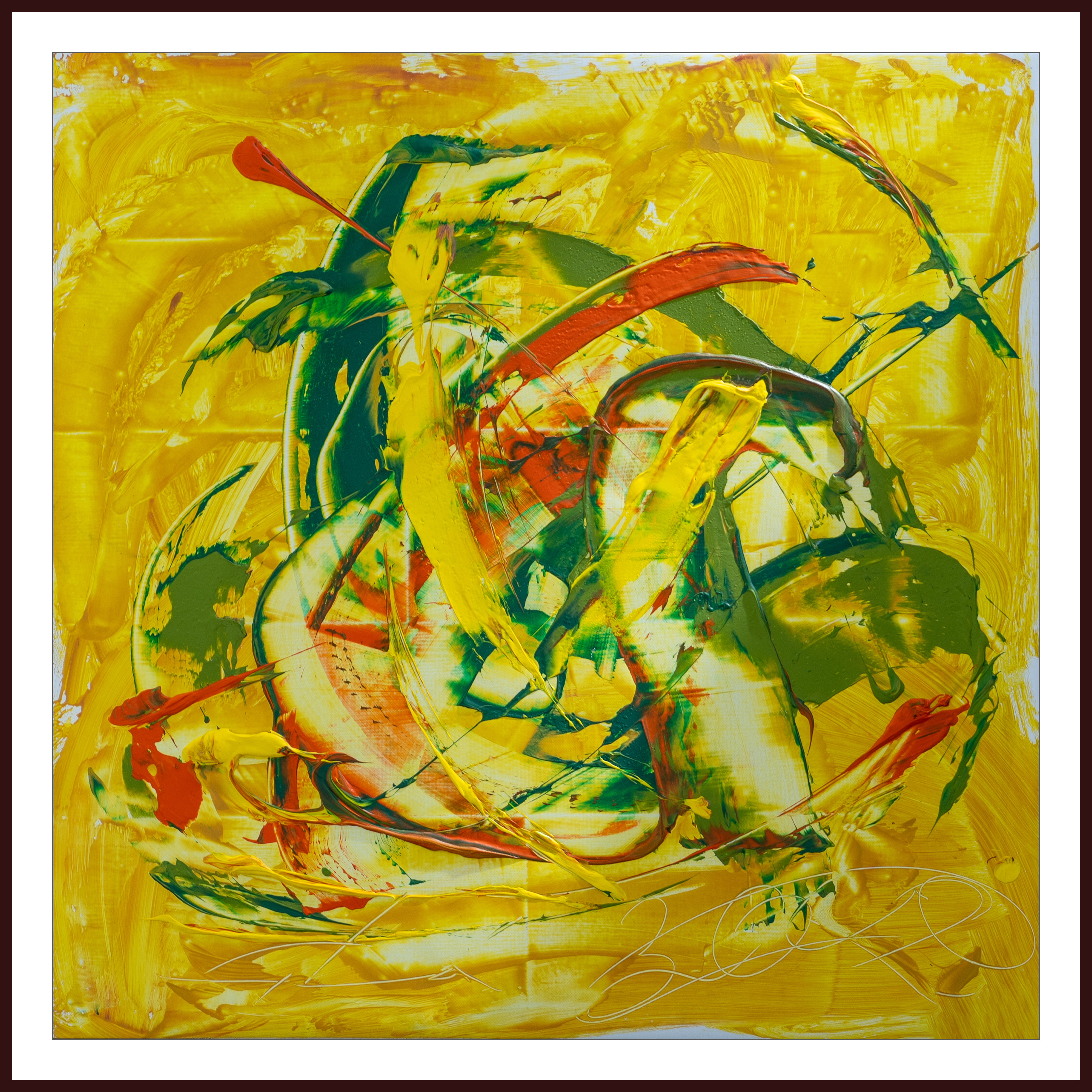 Сергей Дас и Никита З. 13 лет. Холст, акрил. За свою короткую жизнь Никита пережил немало потрясений. Первое испытание — гибель отца в пожаре в частном доме — мальчик переживает очень тяжело, рассказывая, что это его вина из-за забав со спичками. Побывав в нескольких приемных семьях, Никита не раз становился либо свидетелем насилия и несправедливости, либо сам проявлял жестокость. Поэтому какое-то время ему пришлось провести в психоневрологическом диспансере, а потом и в реабилитационном центре. Вспоминая прошлое, Никите становится не по себе. Его картина, написанная, казалось бы, в жизнерадостном желтом цвете у самого мальчика вызывает только мрачные ассоциации. «Мне кажется, что рядом со мной постоянно ходит смерть», — делится подросток.