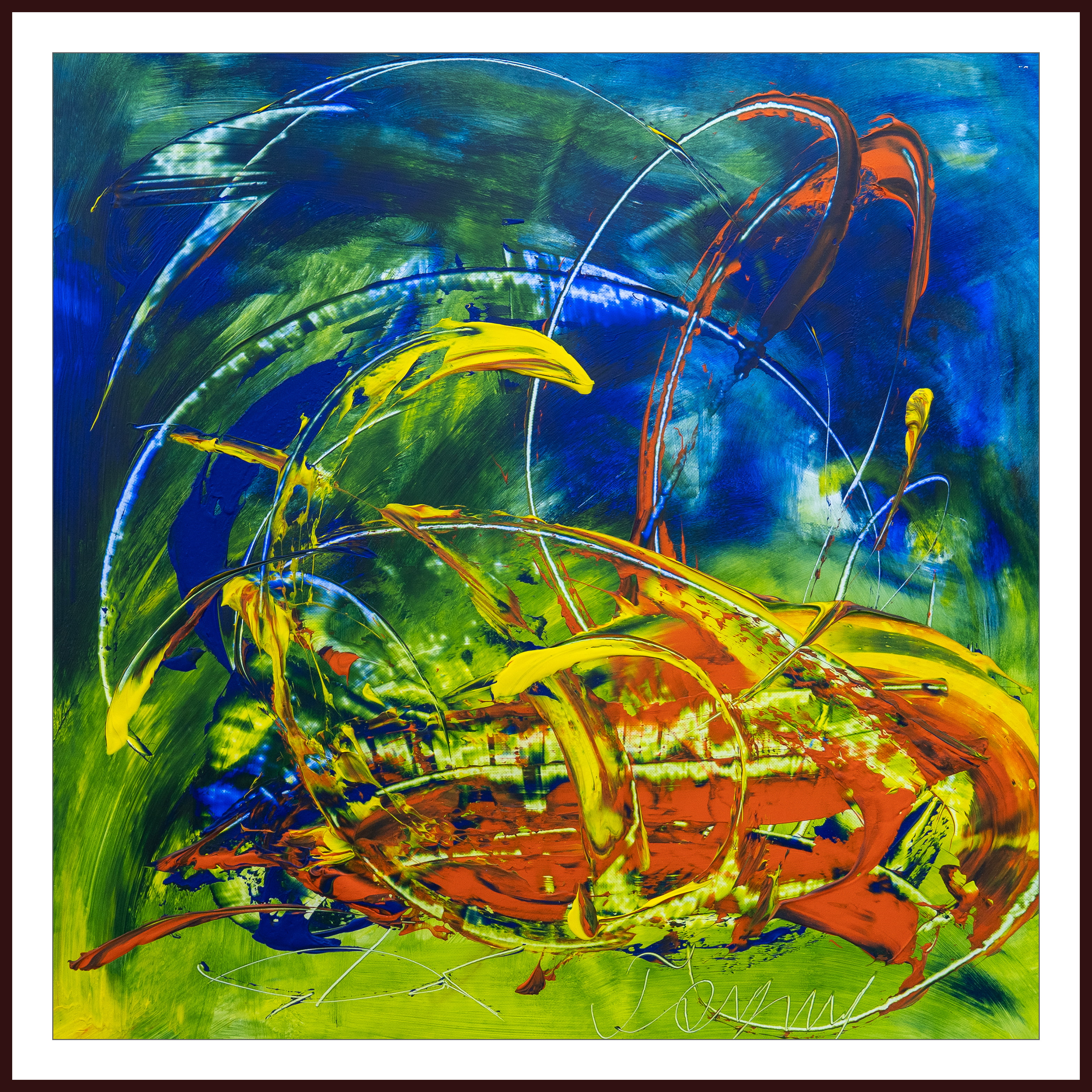 Сергей Дас и Гарольд П.10 лет. Холст, акрил. У Гарольда несколько братьев и сестра, у каждого из которых очень необычные имена — Рональд, Евангелина, Арнольд. Такие необычные имена дал своим детям отец. Долгое время он сидел в тюрьме, но, когда вышел оттуда, не успел встретиться со всеми своими отпрысками, и умер из-за проблем с сердцем. Гарольд был очень расстроен этим обстоятельством, и он фантазирует о том, как было бы хорошо просто надеть шлем виртуальной реальности и, словно в игре, вернуть то время, когда папа был жив, и увидеться с ним. Этой зыбкой надежде и разочарованию от болезненной реальности и посвящена его картина.